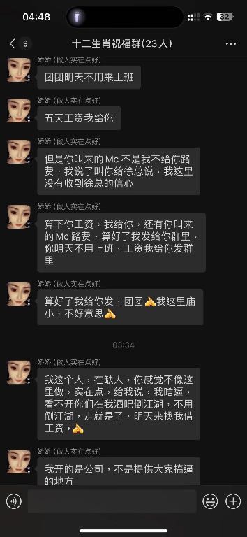 不拉女dj进群,然后有大客她报祝福没人看到破防了!所有人都知道没拉进去,然后看见别人帮女j,她心里不平衡。拉拢mc一起。给了人家三百小费,一起说人家女j!再就是说人家倒江湖!1:人家谈恋爱关你屁事啊!2:就算说同一个公司谈恋爱违反规定,他妈的人男朋友也不是她十二生肖的酒吧!3:你作为一个高管,人家不在群里。你第一时间不是核实问题出在哪里,而是把所有问题归咎在一个女j身上!3:酒吧做了两三年的舞台dm总监,你说下课下课,说人家吃回扣!说人家飞单。浙江湖州的十二生肖酒吧算是被你做明白了!姐姐,你的名字不觉得讽刺吗?总经办你就好好呆哈!一呆一个不吱声