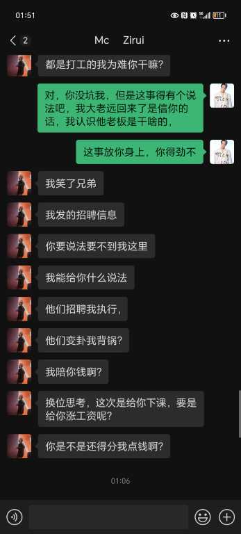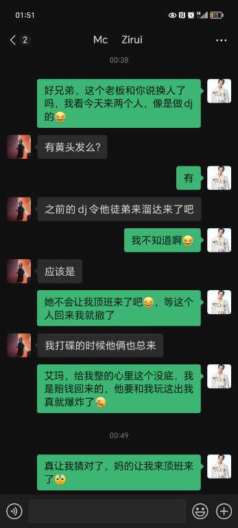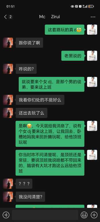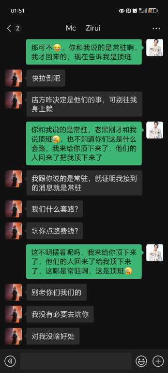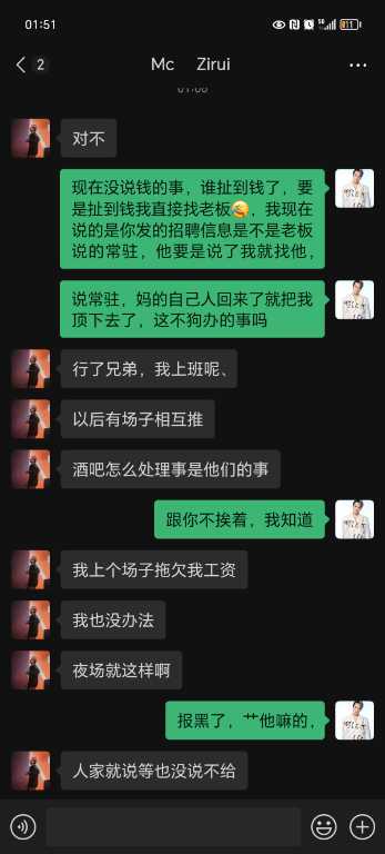 本人于七月份看到招聘信息,七月31号来店里入职,干了能有五天,他们的学徒回来了给我顶下来了,我想问问你,常驻是谁说的,如果你老板不说常驻,那我认为发布招聘信息的不会瞎说八道,而且第五天我下班的时候你是委托老黑mc告诉我的,随便找了个理由说我风格不适合这个店,看资料的时候谁瞪大狗眼看的,我这一趟折腾路费就4000块,就给报300,我差你这300吗?多说无益,空场的兄弟姐妹一定要慎入,永远记着辽源有个这么一家黑酒吧,说的句句属实,如有不实,愿付法律责任,