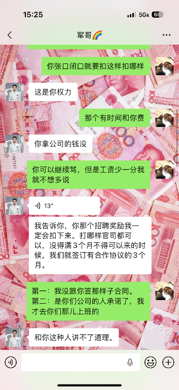 避雷贵州省贵阳市观山湖红街星汉巢酒吧!一店店长梁军拖欠工资索要工资过程中一直骂人。后面消息不回电话不接 我是十月底去他们酒吧上班 他们公司营销答应我上满一个月就给我2000块招人提成奖励 并且还有要求我做gogo的一个月订台业绩要达到一万订不到台就要被罚款 我自己贴了好多钱订台、 而且他们那里跳舞压工资严重 隔两三天才发 业绩不达标加上没有订台都会扣钱   我十二月底正常离职的 两千多工资要不到 半个月了 消息不回 电话不接。各大同行避雷此酒吧!