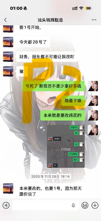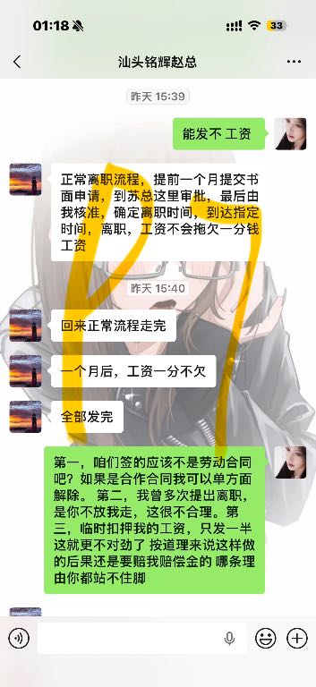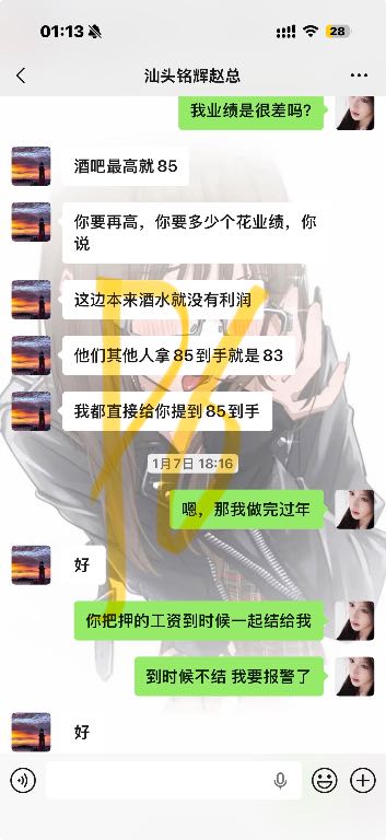 2024年4月份是我们的第一次相识(指的是我和两位老板以下简称为某赵/某勇)我当时还是一个刚从工作室出道的新手DJ,经熟人介绍来到了万恶之源广东省汕头市,我们是从铭辉相遇的,这是我做的第一个花场。自此开始了漫漫夜场之路,可惜好景不长,不到两个月我就突然领悟到了他们的邪恶之处,我得自己给自己打工,11点到5点钟就是我上班的时段,我还得去应酬,打碟一小时,上平台,还给我下任务,最后为什么不欢而散是因为他居然反扣我的工资,800块钱,我的血汗钱,搞得我是怒火攻心,提桶跑路,当然了我的押金他们是没有给我的。