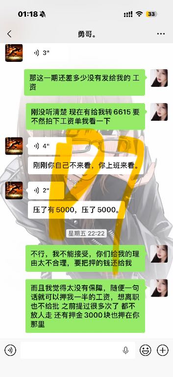 但,此时此刻,让我暴跳如雷的事情发生了,他们居然压我一半工资?(1月11-20合计11615元实发6615 又压5000 不算刚上班压的3000)平时工资条不给发也就算了,这次居然美名其曰说过年了怕人走光所以才出此下策。我真心提问了,他们是不懂法吗?无视法律呢这怎么。我一个无底薪的dj,你害想让我咋办啊老铁。p7