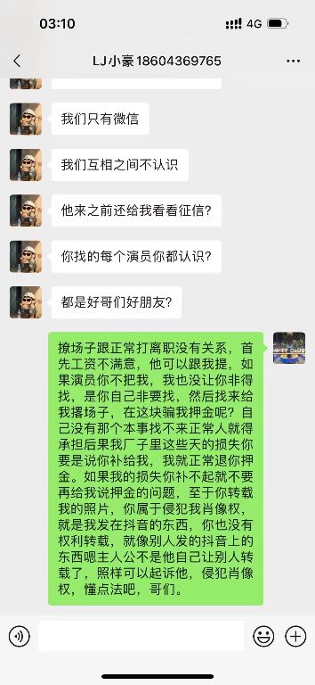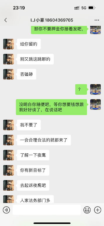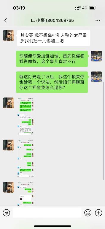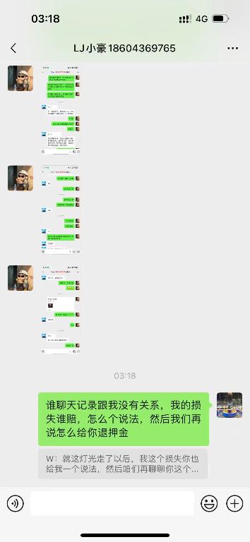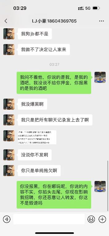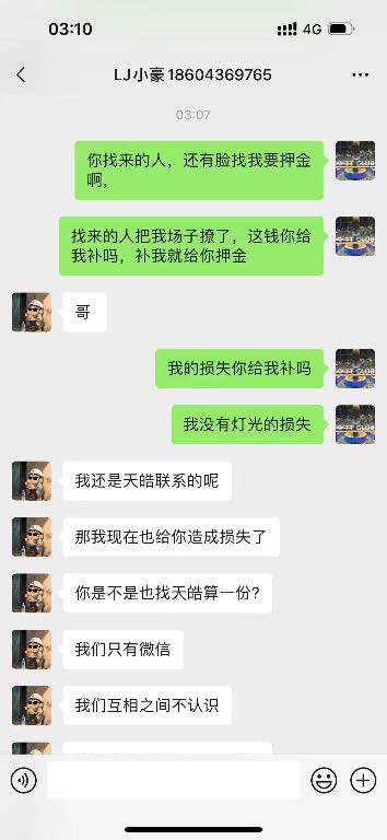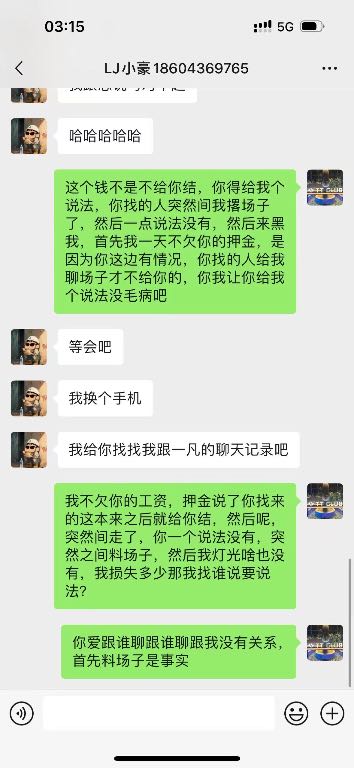 灯光小豪于1月4日入职本店TT酒吧 由于各种原因导致离职!在他走前找来一个一拖三顶他位 在这期间工资一分没差已结清!押金之所以没结清 是年底了 找演职人员不容易!所以押金说了过一个星期结清 可是新来的灯光在职期间 不爱说话 不沟通 自己撩场子跑了!!导致我酒吧当晚没法正常营业!所以我就跟他说了这件事 可是一直没得到回应!最后报黑我!我想说的是我一直没说过不结算押金!但是人是你找来的,突然之间撩场子 你得给我个说法吧?以下是图片聊天记录!特此声明 此事必须维权  恶意摸黑本店及配合灯光师小豪恶意传播资料的我们将追究其法律责任 坚决不和解