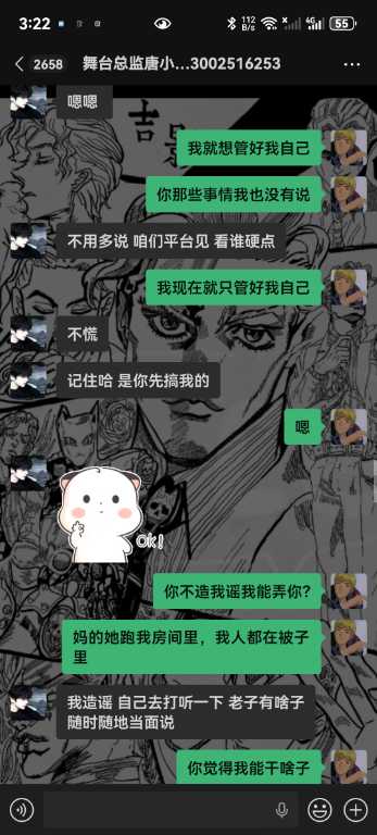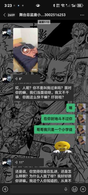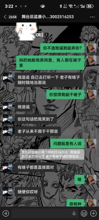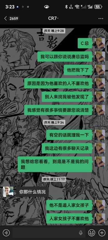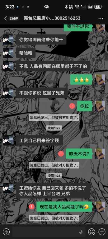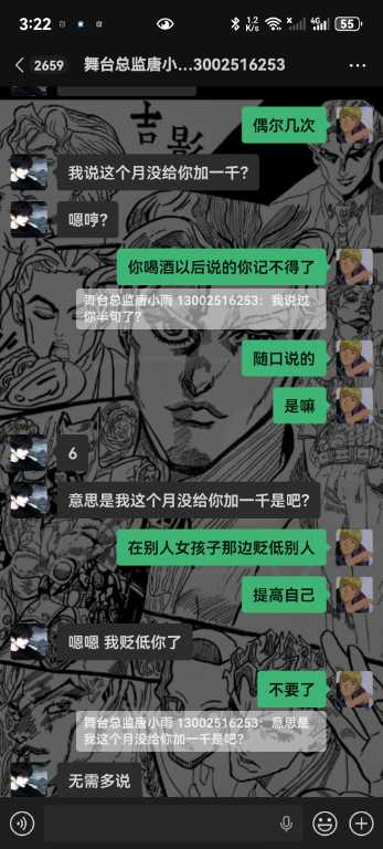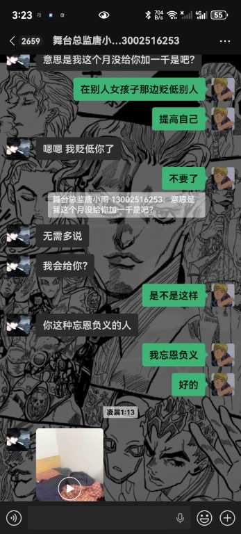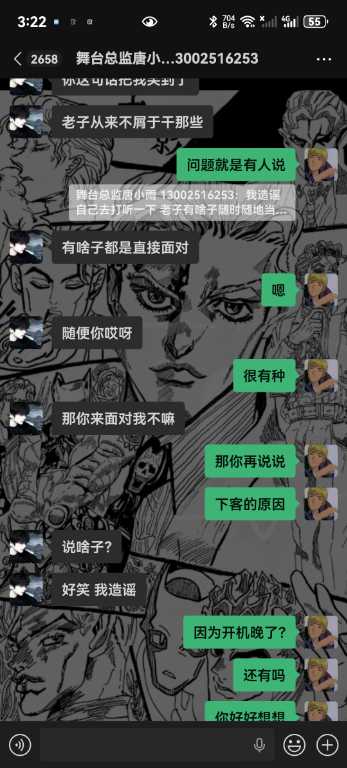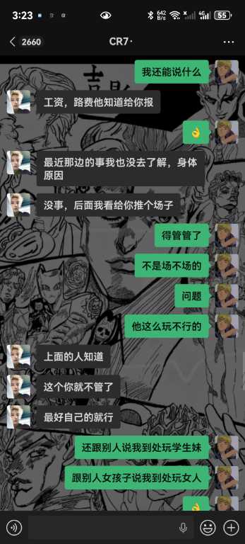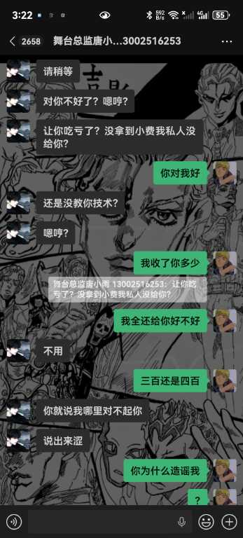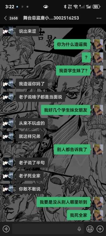6.我从未跟你们反着干,你敢把所有的记录全部发出来吗,唯一一次反着干是因为哪个女孩子不喜欢你,她自己来找我的,说我跑路,明明是你叫我滚的,直接把我从群里面踢了,说我卫生不收拾?你连下我客的原因都不肯告诉我,我甚至现在都不知道你为什么要这样对我,你对我一点尊重都没有,我凭什么尊重你,学徒也是人,不是你的狗,还说我背后说你坏话,你造谣是耍学生妹那些我全部都有证据的哇,我只想证明我没有耍,我人品没问题而已,我只是一个小学徒。你不要以为只是随便嘴巴说说我就不知道了啊,再坚硬的墙也是会漏风的啊,再一唐总,我真的从未说你业务垃圾,而且整个舞台部加上我也才4个人,你为什么发帖子嘴巴里也一句实话都没有啊,就只是因为女孩子吗?我真的从未勾引过她们,真的都是她们自己来找我,我全部记录可公开,我不知道你为什么要跟我一个学徒过意不去,我本来只想私下解决这件事的,没想到你还反咬我一口,记录那些你全部放出来吧,我也想看看我到底哪里得罪你这尊大佛了,你身边认识的女孩子不知道你跟她们都干了啥,我每天下班就上上网,真的无意参与到你和那些女孩子的漩涡中,对不起,我只希望你管好下面,不要再欺负良家妇女了,你现在这个样子像个发情的泰迪你知道吗,纯小丑,我本来都不想搭理你,我就发个朋友圈发发牢骚你就给我挂网上,还说让我永远都找不到场子,出来混都是要还的啊,我本来都很尊重你的,不过你跟我说的那些话,真的很像一个地头蛇,你说给我留点面子,但是你所有的话好像都在夸大其词,现在还找我现在的总监说我人品不行,我一个刚出来的学徒,找场困难我求求你放过我好不好