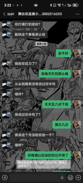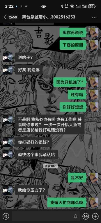 2.装设备从开业到现在包括我离开,总共就两次,下午六点装音响,你下午四点通知,为什么不提前通知,是你的工作失职变成了我个人的原因,还有舞台上的两台烟机,我从开业来,就发现有一台烟机不出烟,跟你反馈你也不管,这个工资群里面都有记录