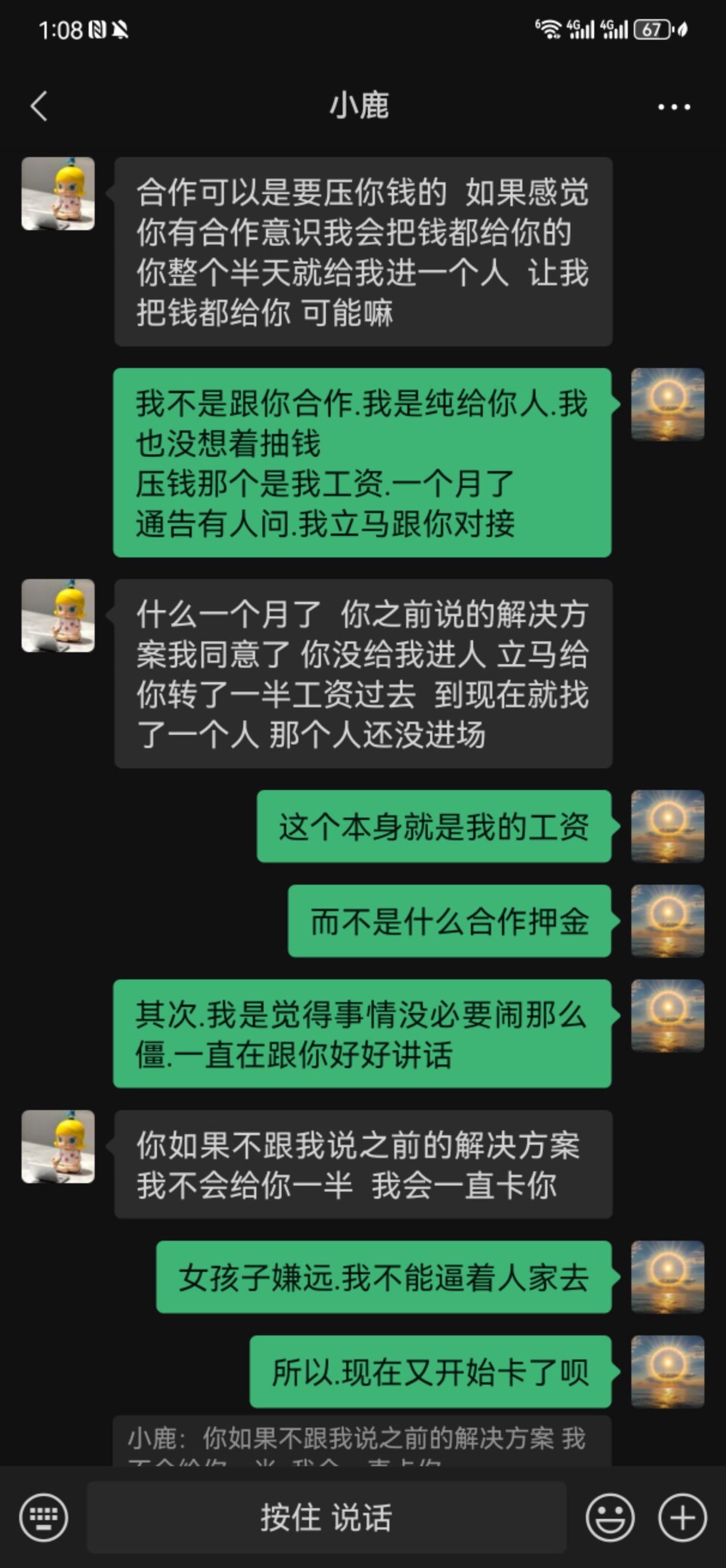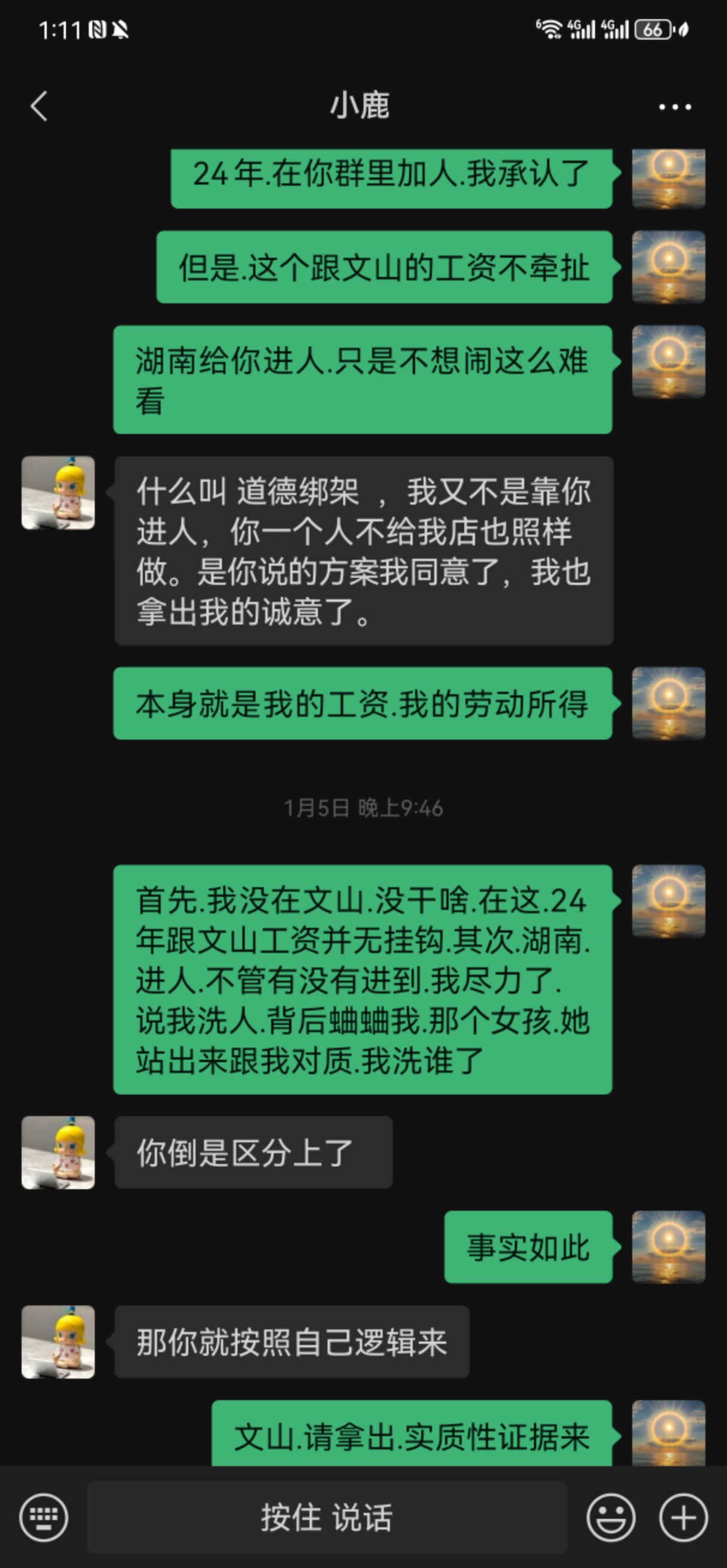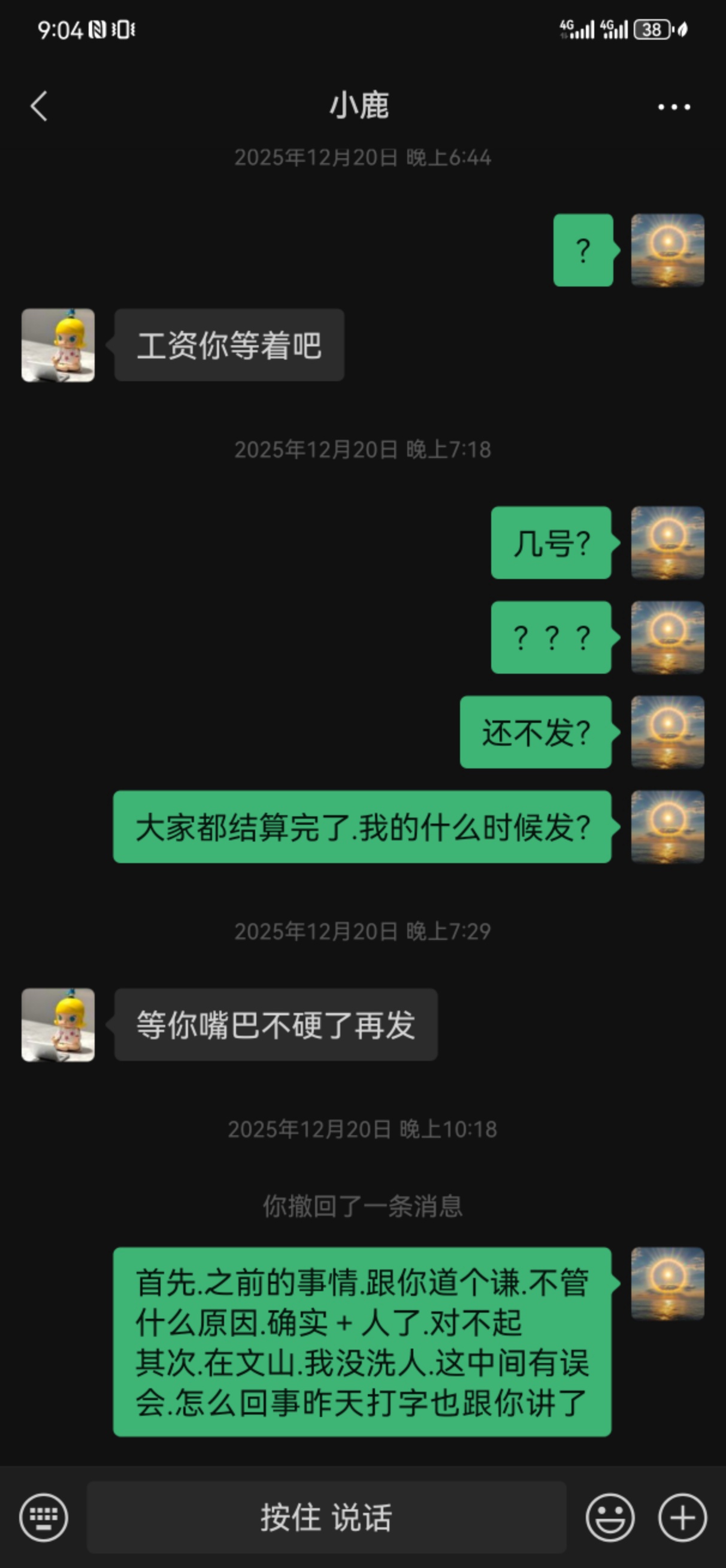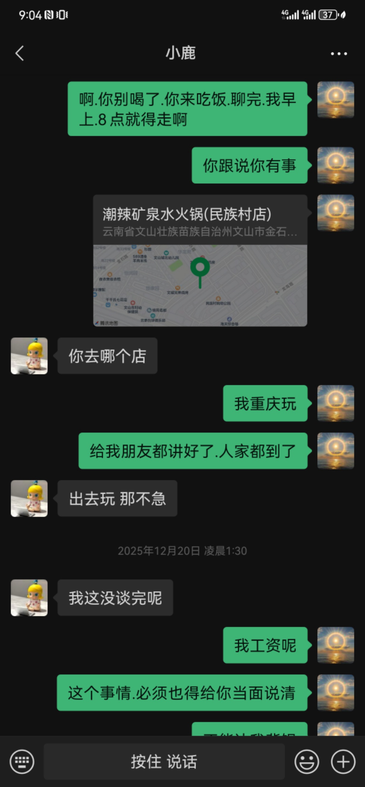事情的起因是25年11月中旬本人跟她云文山活动.保底模式.一期.26天(时间到了我要撤场).保底基本都是日结.工资死拖.10天半个月发一次.到了25年12月1—12月18工资一直未发.后面问她说我洗人.正好她要来文山当面聊一下.(当时还给她文山喊朋友过来)已经订好路程要撤.让我等她当天聊聊.当天小鹿到后.我就一直找她.她一会要睡觉.一会要应酬一会要喝多了.一会晚点见....本人等了一天未见到小鹿.无奈只能先走