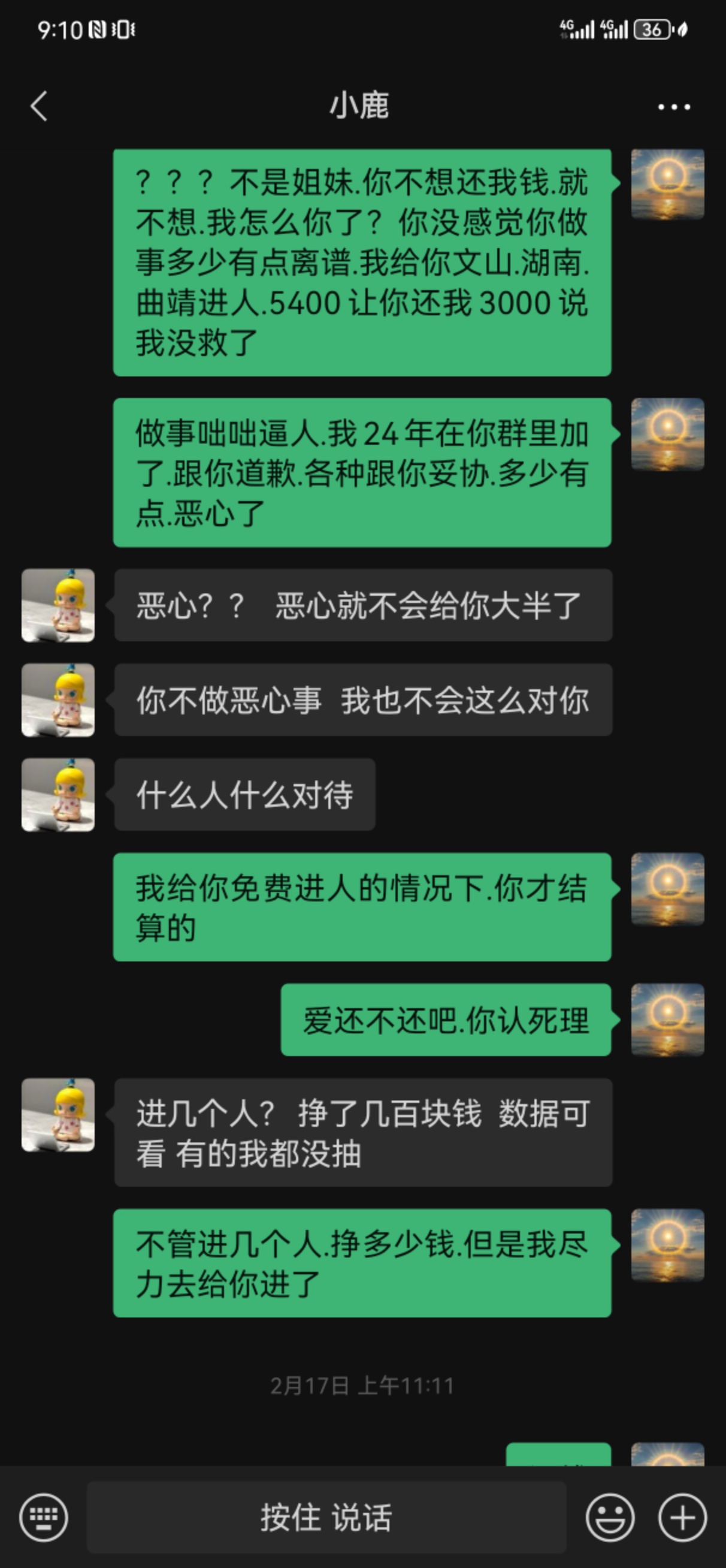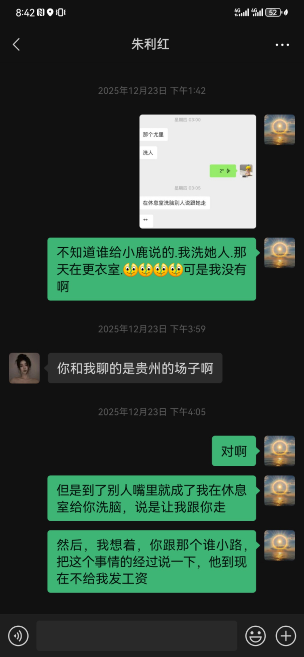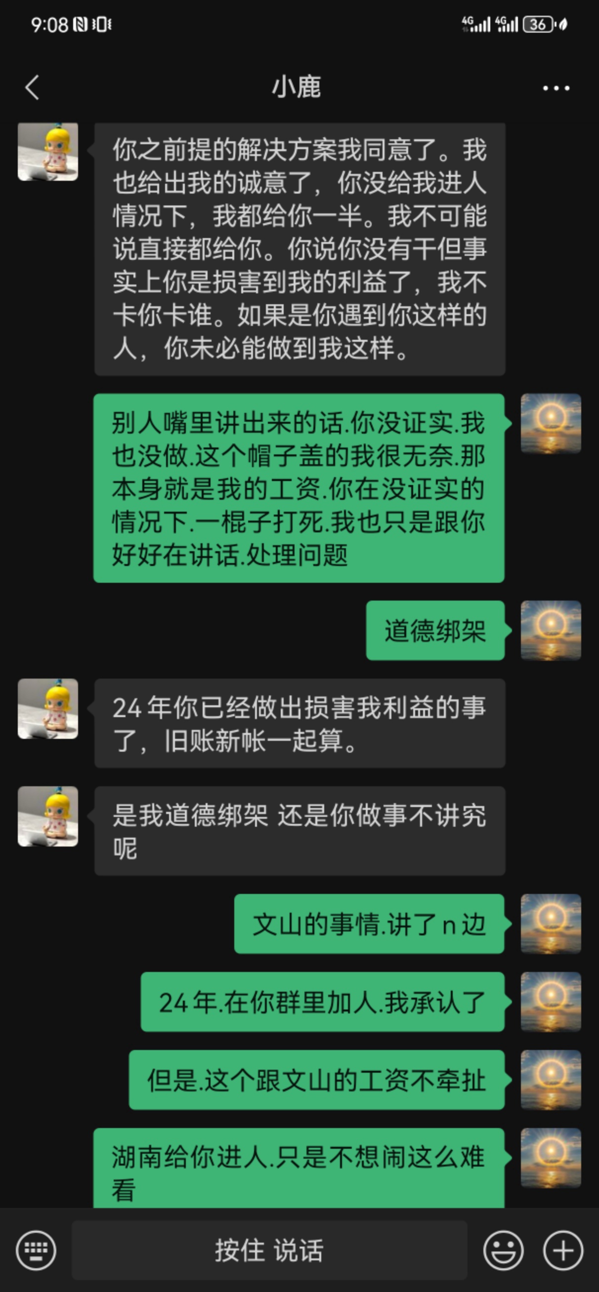 事情的起因是25年11月中旬本人跟她云文山活动.保底模式.一期.26天(时间到了我要撤场).保底基本都是日结.工资死拖.10天半个月发一次.到了25年12月1—12月18工资一直未发.后面问她说我洗人.正好她要来文山当面聊一下.(当时还给她文山喊朋友过来)已经订好路程要撤.让我等她当天聊聊.当天小鹿到后.我就一直找她.她一会要睡觉.一会要应酬一会要喝多了.一会晚点见....本人等了一天未见到小鹿.无奈只能先走