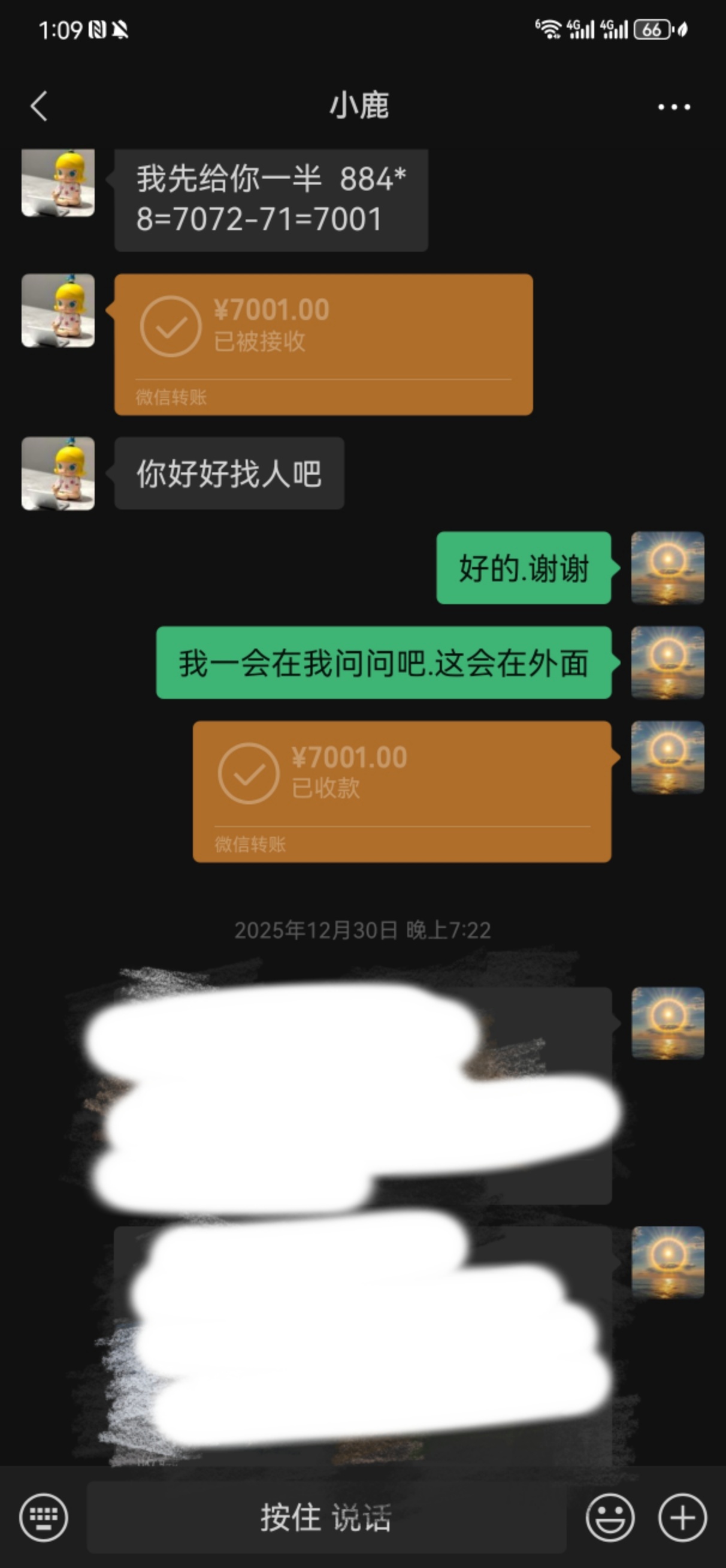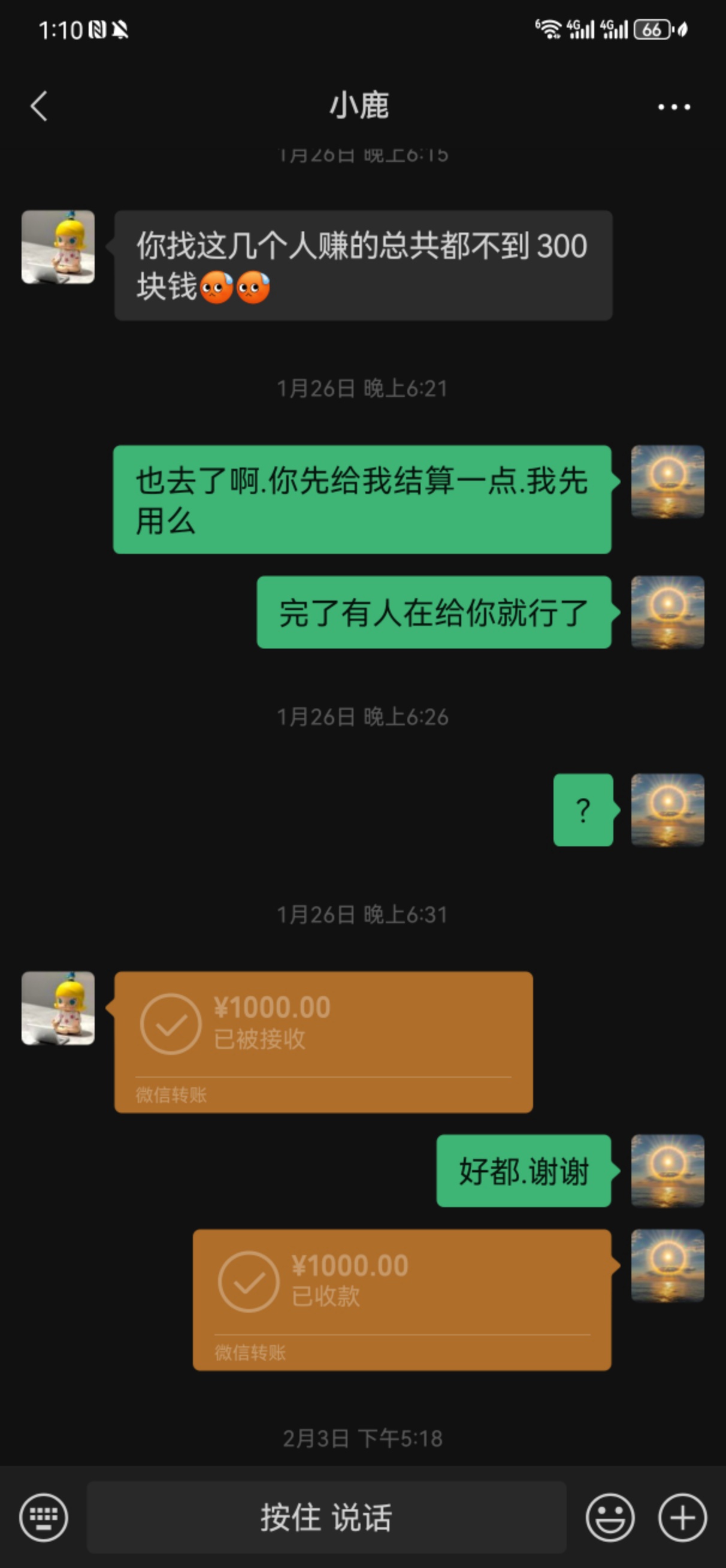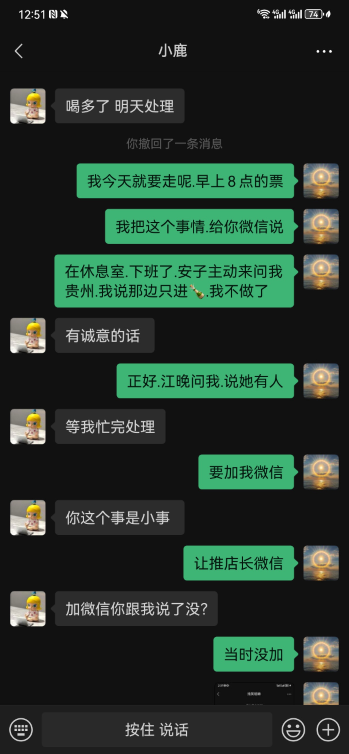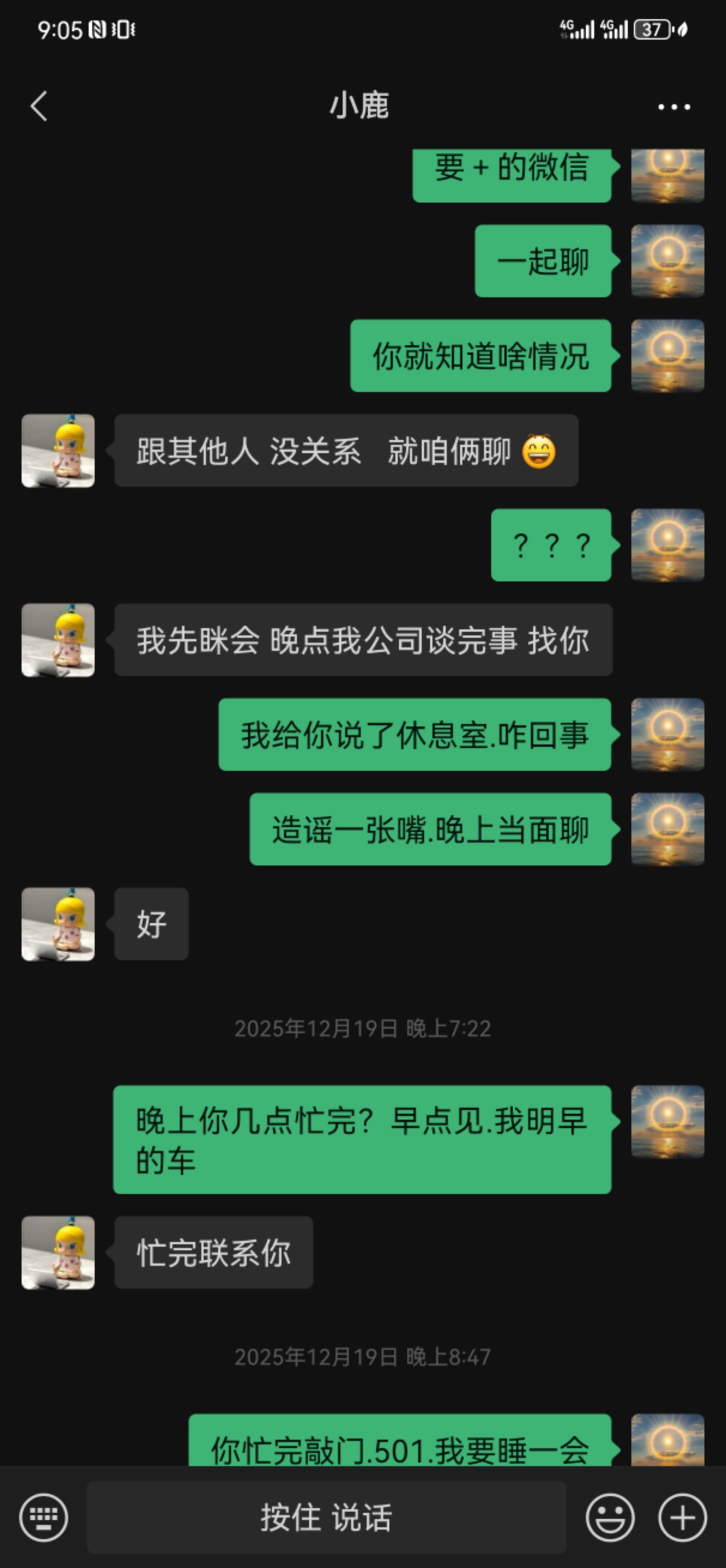 事情的起因是25年11月中旬本人跟她云文山活动.保底模式.一期.26天(时间到了我要撤场).保底基本都是日结.工资死拖.10天半个月发一次.到了25年12月1—12月18工资一直未发.后面问她说我洗人.正好她要来文山当面聊一下.(当时还给她文山喊朋友过来)已经订好路程要撤.让我等她当天聊聊.当天小鹿到后.我就一直找她.她一会要睡觉.一会要应酬一会要喝多了.一会晚点见....本人等了一天未见到小鹿.无奈只能先走