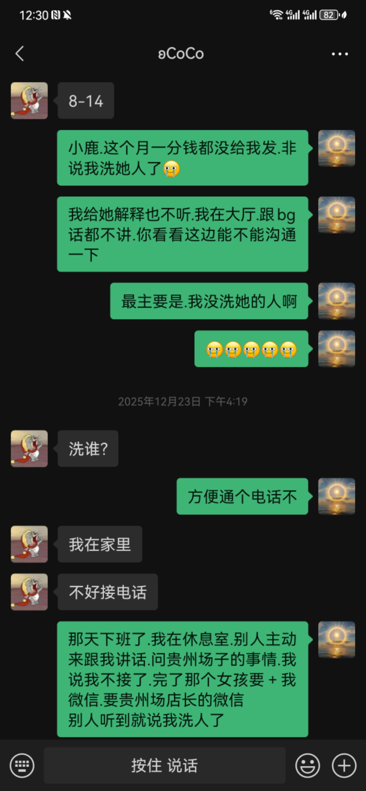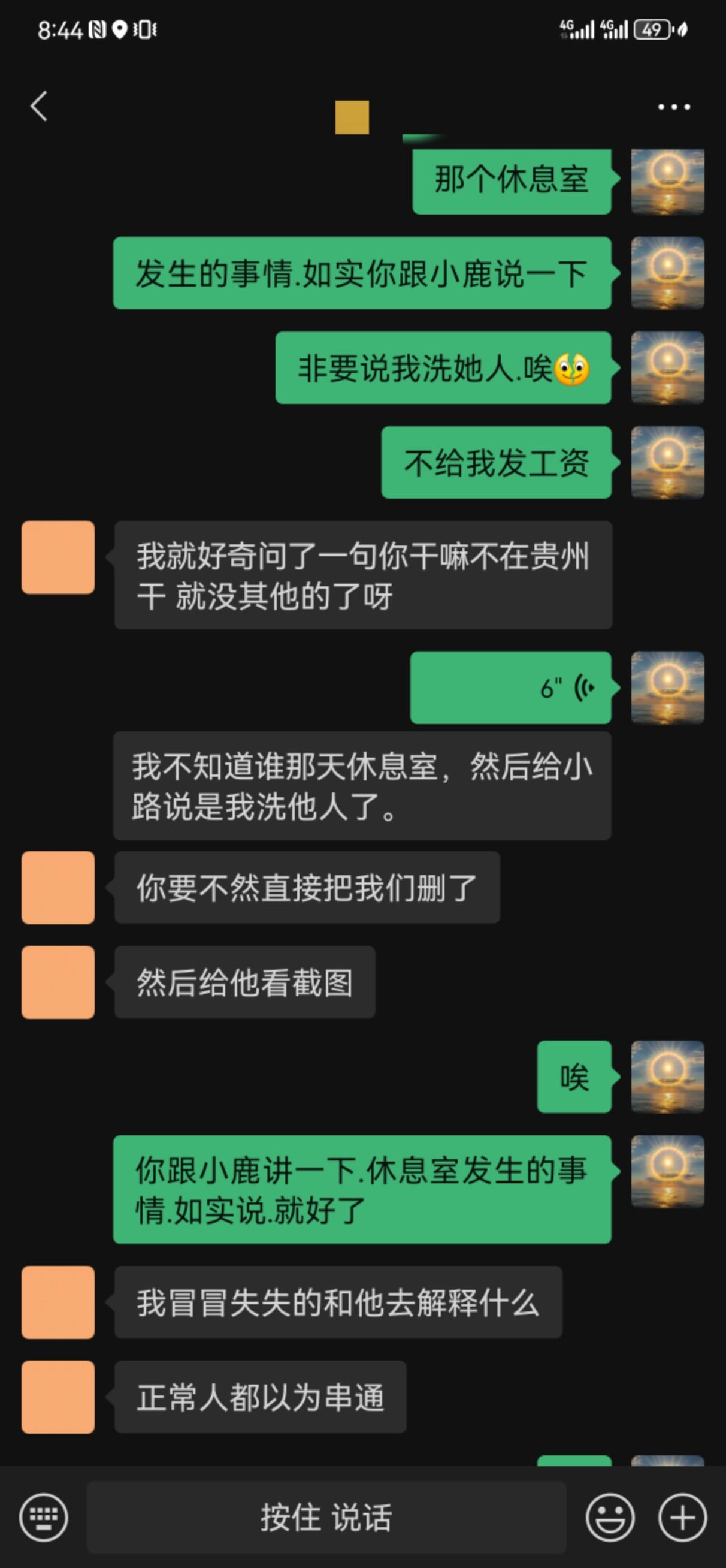 自己不核实.故意整我.恶心我.后续问她要工资.说我24年初在她群里+人.那这个事情我承认.咱做了.咱认.冤枉我在店里又洗人.认不了一点.没做的事拒绝背锅.以下是冤枉洗人事情的经过.解释无数遍.并且当时发生事情的人员拉群.她直接退群