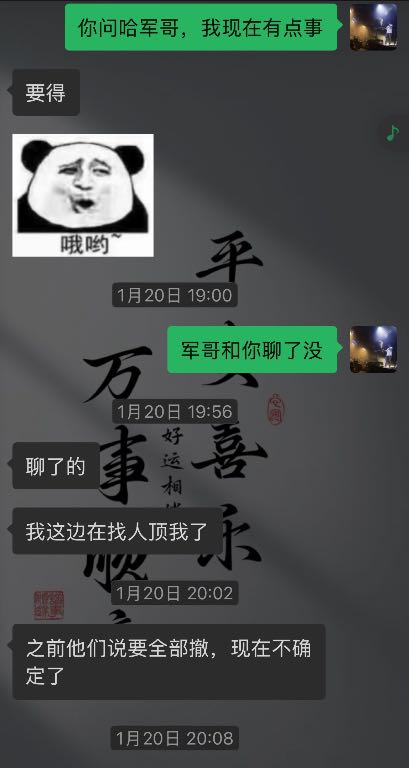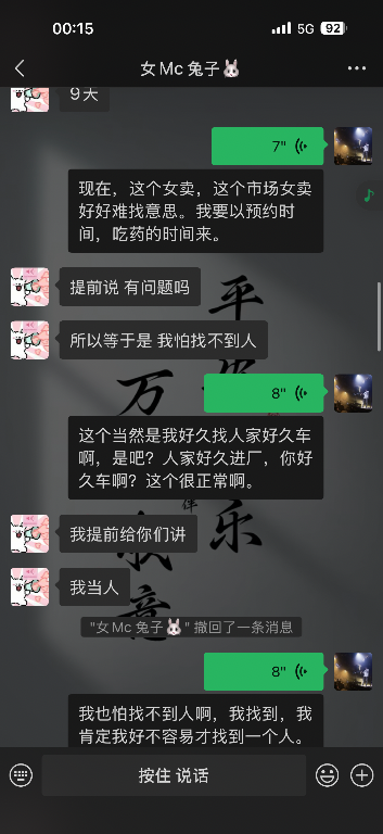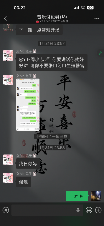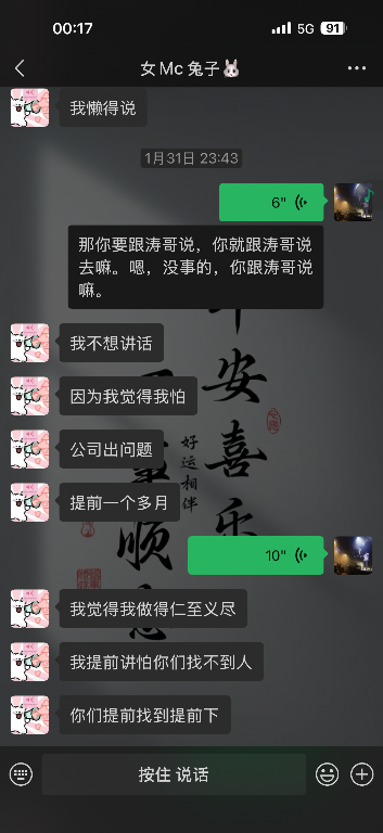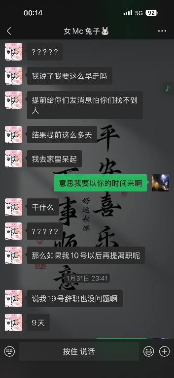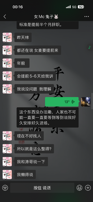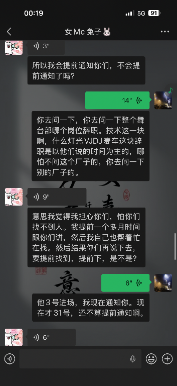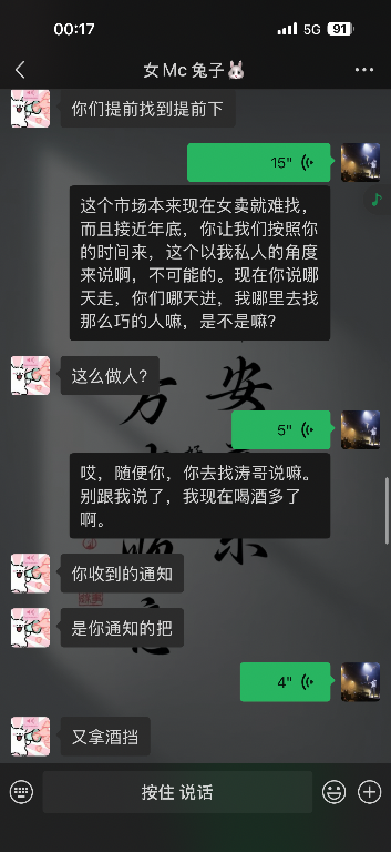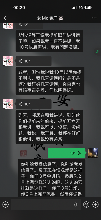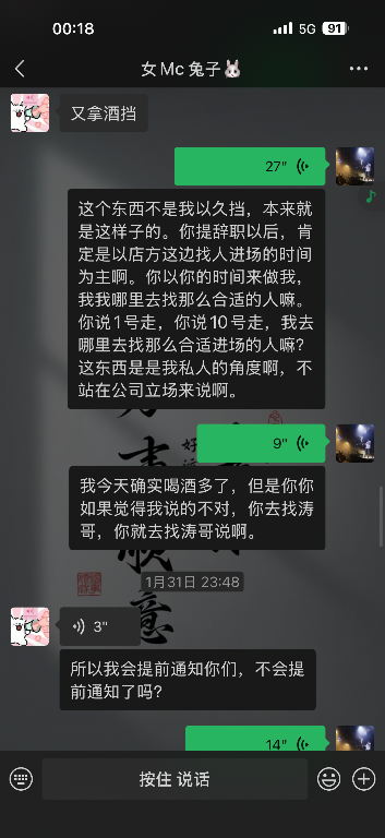 想必大家也都理解,舞台人员辞职,要么自己找人交接工作,要么店方找人交接!辞职差不多半个月她都没找到人来,后面还是我们找的以前合作过的老人返场(最后一图可见),这货居然说要按照她辞职的时间(大年初三)来让我们安排人进场!截图可见我当时是在好声好气和她解释这些事情的,她还是不能听进去,用贵州话说就是咬卵犟那种,说什么我们不当人之类的话,我都没和她计较在耐心和她解释,让她去别的场子打听一下哪有这种说法,本来目前这个市场女麦就不好找!
