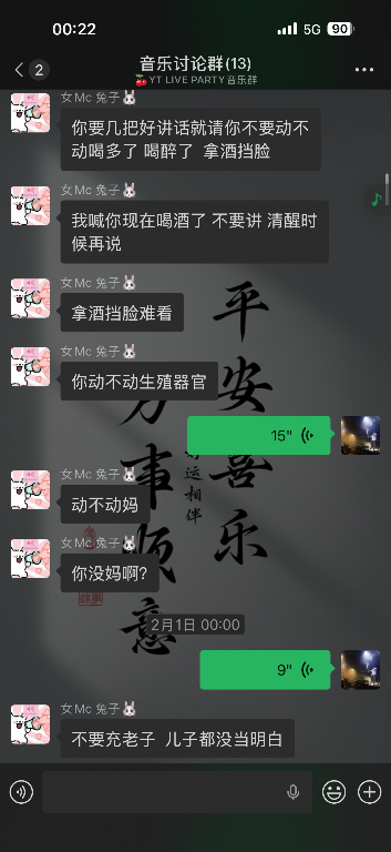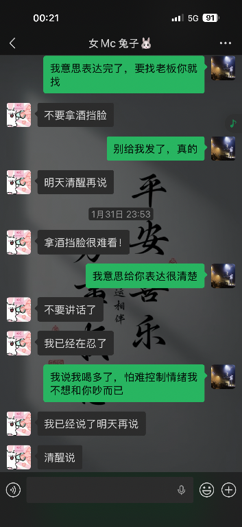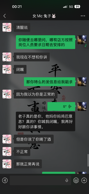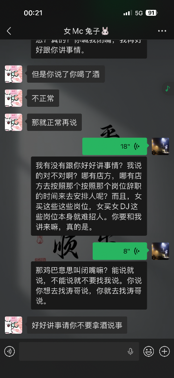 然后再说她说我踢了gogo这个事,当时是因为这个gogo在某桌跳完舞就走了,另一个gogo在旁边桌应酬,她跳舞的那桌客人就问另一个gogo刚才那个女孩子去哪里了,另一个gogo就在群里问了一下,这个gogo像吃了炸药一样就开始怼人了,我才踢出去的,而且后面我和他们资源部老大也说清楚了的,这个很多人可以证明。这个事和我与她的事没有任何直接关系。