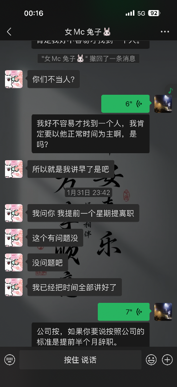 图一当天来问我这个事情,因为当天我们店的品牌副总过生日,我当时在饭桌上还和副总说明天再通知她几号交接的事吧,当时她也在饭桌上,我说今天在吃饭也喝了酒不说工作的事情,她来问我是因为她和新来的女麦有微信才来问我。后面我和她说的让她在做三天,她就开始一顿输出了,说什么提前五六天通知,后面我和新女麦沟通了一下,也满足她了让他多做了五六天才离职的。