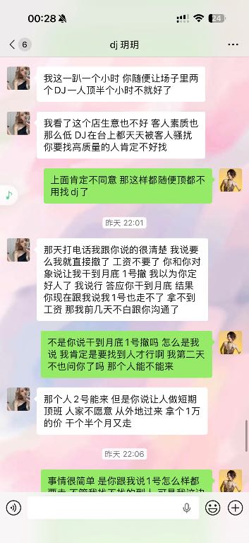 【Dj玥玥】《大名邱芷玥 》避雷这种“大小姐”“公主病”⚠️ 事情很简单!进场前都已经说清楚了酒吧风格以及模式 到场之后上班第一晚就开始说这不好那不行 说客人没素质 揩油她 就说要走 然后我说可以 但是要按正常流程国际惯例 等我安排好了人交接好了就可以走工资正常发 结果她连续都吵着要走 说受不了最晚做完28号就要走 我说那尽量找人 能找到就可以走 没找到没办法走 我并没有答应你说确定了做到月底就可以走 而不是你想几号走就几号走 场子要求高并不是我凭自己决定的!你说让我们自己员工顶着 那我们自己员工又凭什么帮你顶呢 你自己破坏规矩不按流程来 还给我安排上了 后续像领导反映了这个问题 说这样子的话是结不了工资的 更何况进场前说好的压五结十 她这还没到五天就相当于是押金 如果她做超过五天出现这种想走就走 撂挑子的话 先别说押金工资都不可能给你结! 相信圈内人都明白的道理 离职可以但是得先找到人对接好了才可以撤 更何况我们场子正常办完离职手续了第二天会马上把押金和工资结清不会拖欠任何人 没有规矩不成方圆 想来就来想走就走 公司不是我一人说了算 反倒恶人先告状了 总之请同行擦亮眼睛 避雷这种“老鼠屎”
