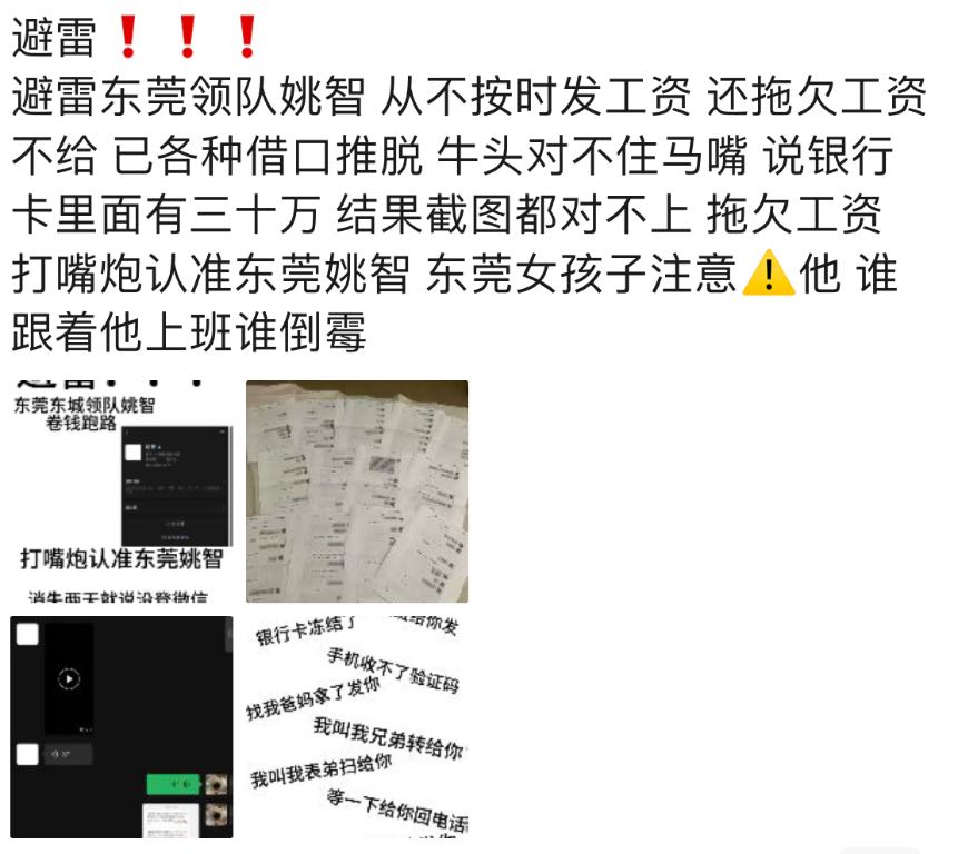 湖南省在广东带组经纪人姚智,拖欠工资提成,银行卡冻结,我叫我表弟扫给你,我叫我兄弟转给你,人家辛辛苦苦订个台,一分一毫喝回来的钱,圈钱跑路,打麻将也输钱不承认,同行各位老板,女孩子避雷姚智还有下面微信的这个人,上班罚款还是罚款,手机坏了收不到信息,就是不给打工人结工资,湖南出了你这么个玩意也是悲哀,没谁了还能拿父母生病当借口不发工资还钱发提成,你爹妈养你这么大真的是该塞回炉里重新造,避雷姚智❌❌❌❌❌下头仔
