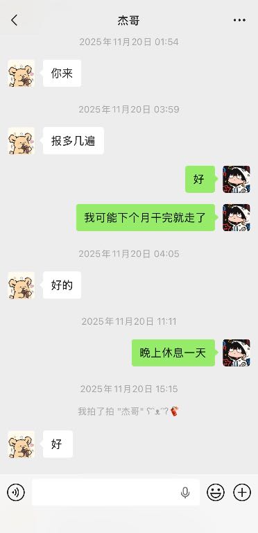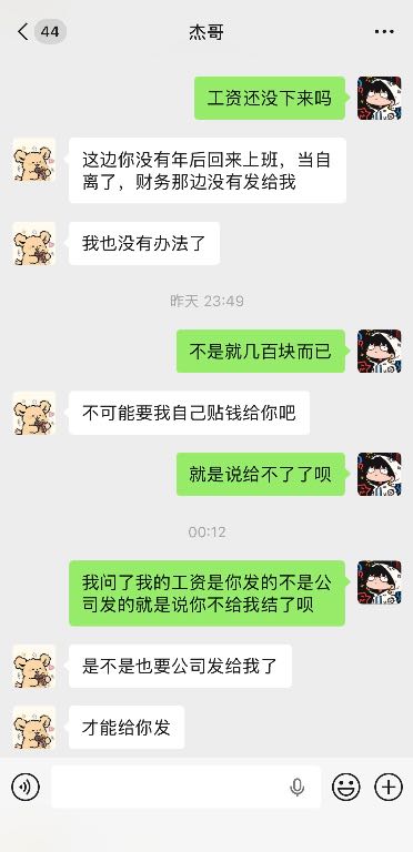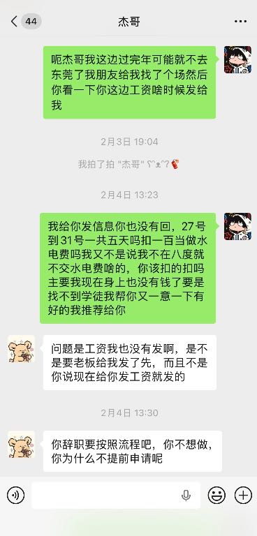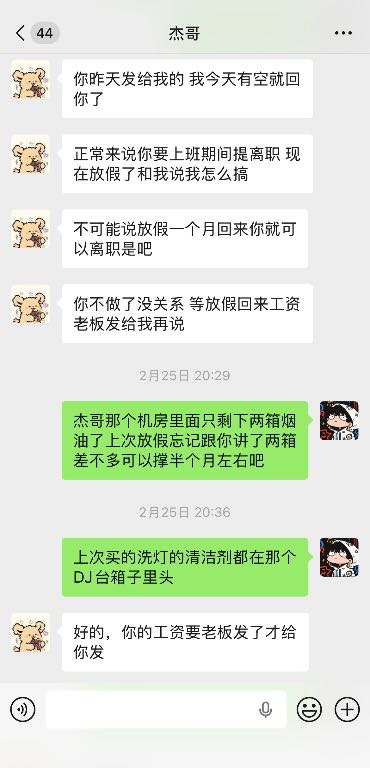 之后我开始找新的学徒工作,找了整整两个月都没有合适的,时间到了1月底,酒吧生意惨淡提前放假过年。放假期间,我第三次正式跟他提离职,明确说过完年不再回来,他当时在旅游,看到信息不回,第二天才回复,承诺开工发工资就给我结清。