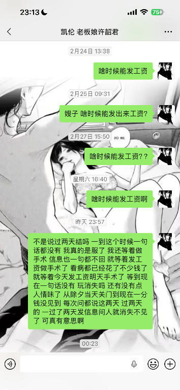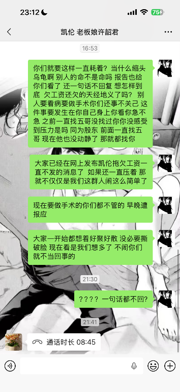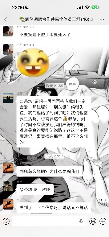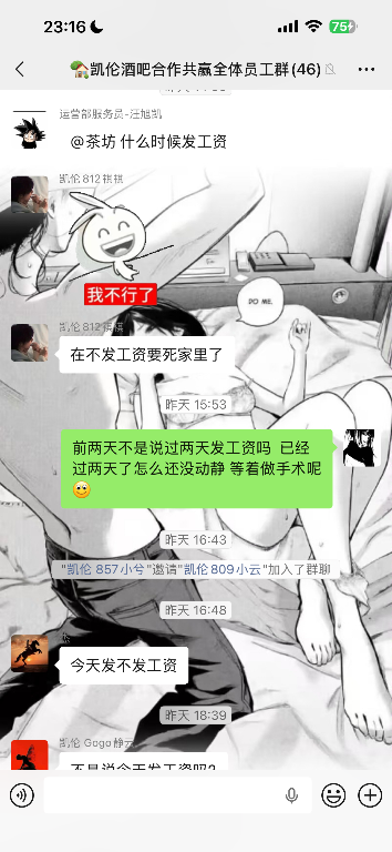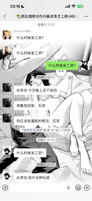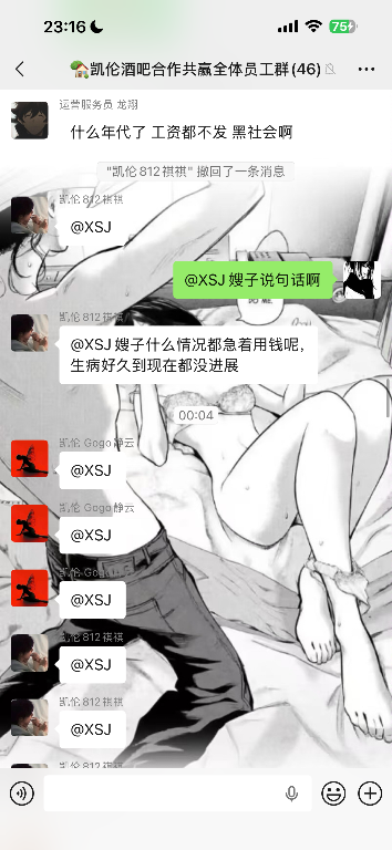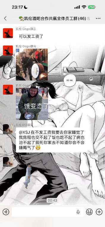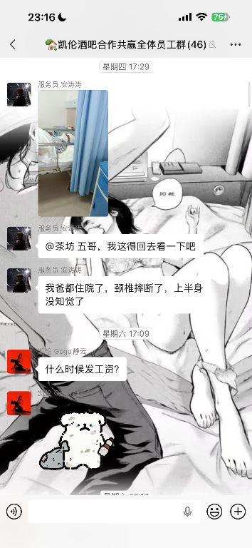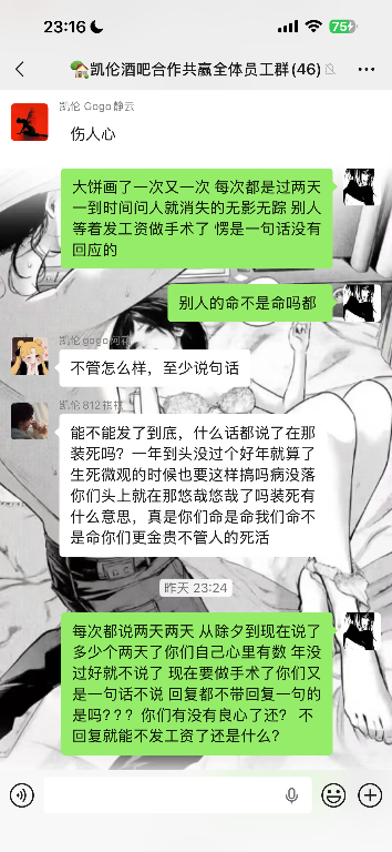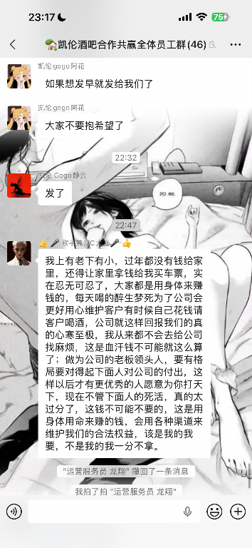 汕头市潮南区仙城镇凯伦酒吧拖欠工资数月。拖欠员工工资,离职人员也一样拖工资,根本不管别人死活,大过年的关门员工身上一分钱没有在宿舍吃泡面 。1月16号停业到现在沟通无数次,都以各种理由搪塞。辛辛苦苦上班 到头来工资一拖再拖至今🈚️果(各大资源队长以及单飞女孩子谨慎合作)各位同行注意避雷❗️