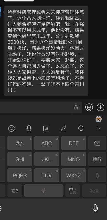 所有驻店管理或者未来接店管理注意了,这个吊人刘浩轩,经过我周杰,进人到合肥庐江星际酒吧,我一在强调不可以用未成年,他说没有,结果查到他组里有未成年,公司罚款我5000块,因为这个事情我跟公司闹掰了撤场,结果撤场没两天,他回去驻场了,还说什么没有对不起我,一开始就说好了,要撤大家一起撤,这个逼人自己回去做了,太恶心了,这种人大家避雷,大大的反骨仔,我怀疑就是故意上的未成年翘场子,不得好亖的狗B,一辈子吃不上四个菜!!!!!