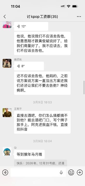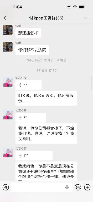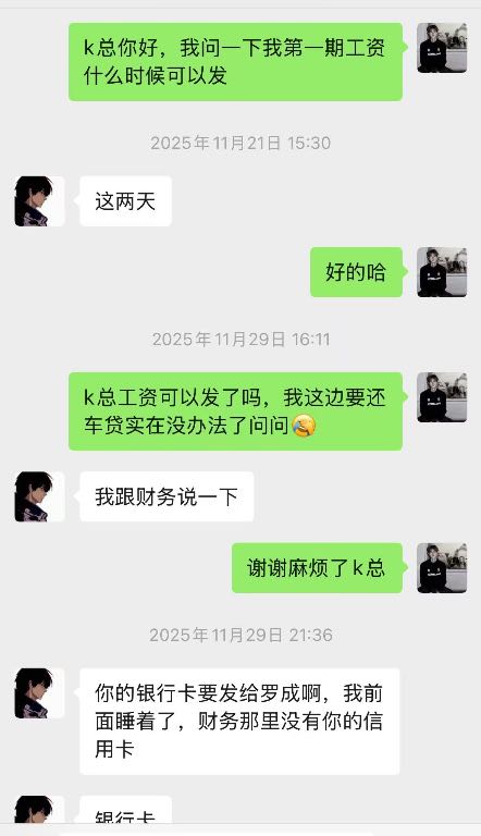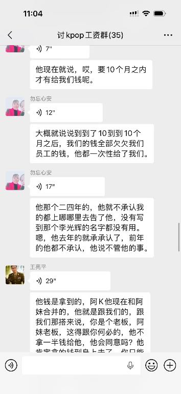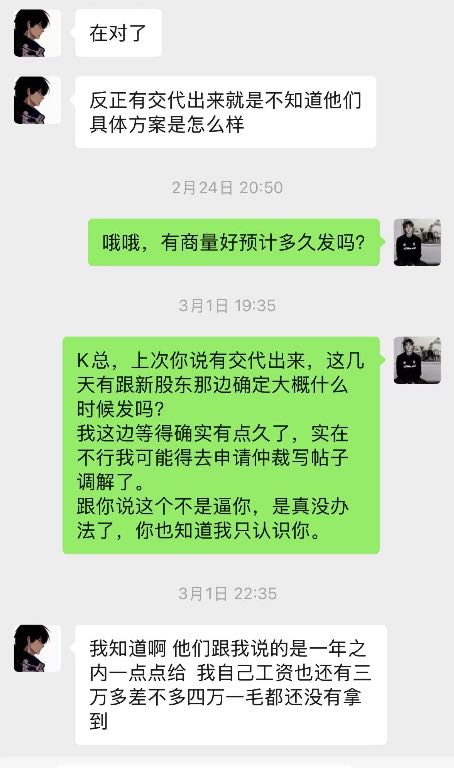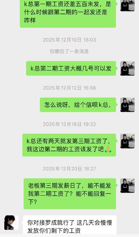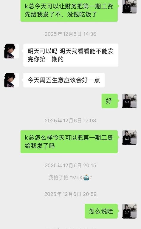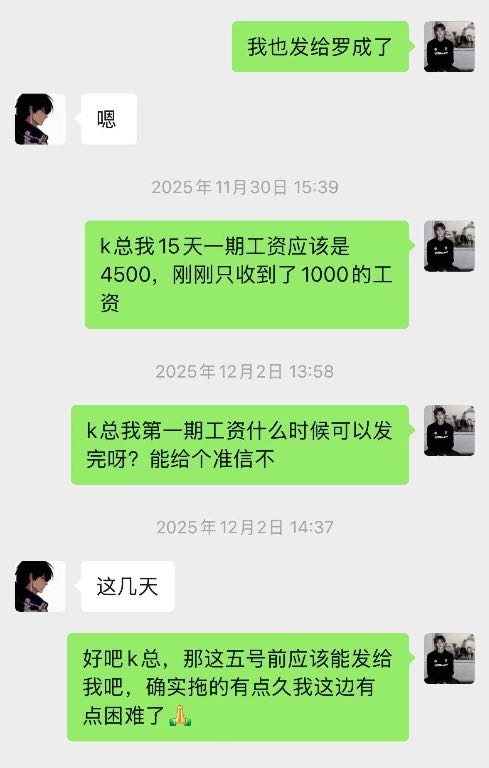 本人从去年2025年11.1号开始入驻上班在韶关kpop跳舞俱乐部,一开始说好的价位是9一个月,这边是压5结15到第一期工资就开始拖,然后开始要工资然后就给我发了一千然后我后面再要拖了一星期左右给我结完第一期工资只有4000,我纳闷为什么少了500,跟我说我工资也是8,那来都来了也没办法少一点也先做着,本人继续工作了一个月,第二期,第三期工资就一直没发,如图所示,2026年一月一日他们说是停业准备转店,店转出去就结工资,结果他们又找了新股东合并重新开业,我们这些旧员工的钱迟迟不发,到2026年也就是今年三月份基本上所有人工资还是没有着落,打劳动仲裁开庭庭上表示今年内结完,本人无奈只好写这个帖子,不针对任何人,只希望这个店这个公司的所有股东和负责人能尽快把欠我们的工资发出来!所有找工作找到这个店的同行慎重考虑!