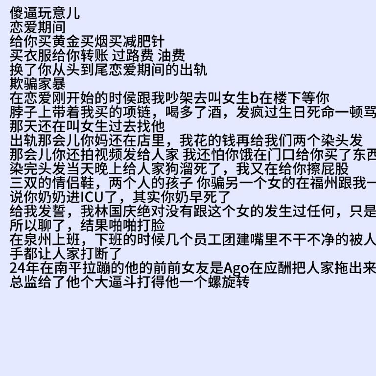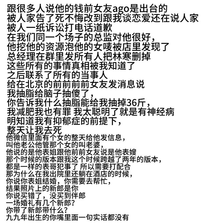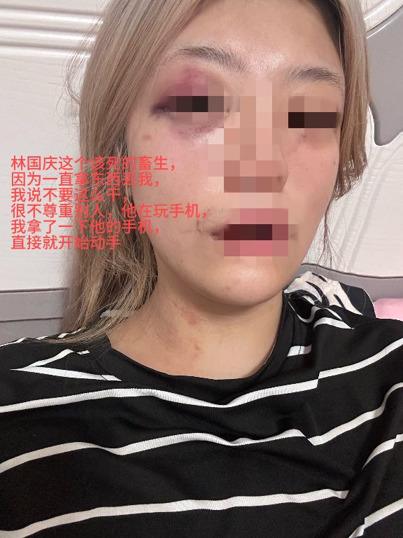 在泉州的时候,他着急想过去没有顾忌,我当时抽完身体都没有一个月 因为两个人吵架的原因在化妆间里面有手机猛砸向我的腹部 当时我已经痛得在化妆间里面哭出来了 我倒是想我什么都不要了,我也要报警 警察调解完两个人签了谅解书,我要回我们共同住的地方收拾东西走那个女的给我拍视频,证明我没有拿东西,结果他把女DJ拎出去要打人家 转头就动手扇我 扔我的东西 不让我走  在那个期间我发现我怀孕了我们去完医院的当天我跟之前的同事抱怨跟林寒有点过不下去了,老吵架 知道这句话犯了天大的错,我那天刚做完手术手上还针他开始打我的脸扔我的手机压在我的身上,我根本就动不了 我实在受不了了,收拾东西跑了,打电话威胁我要告诉我的家里人是错的,不是我,我不怕,我跑到了外地,他继续打电话问我在哪里