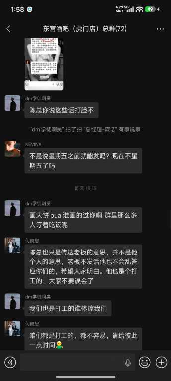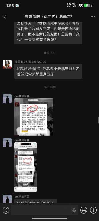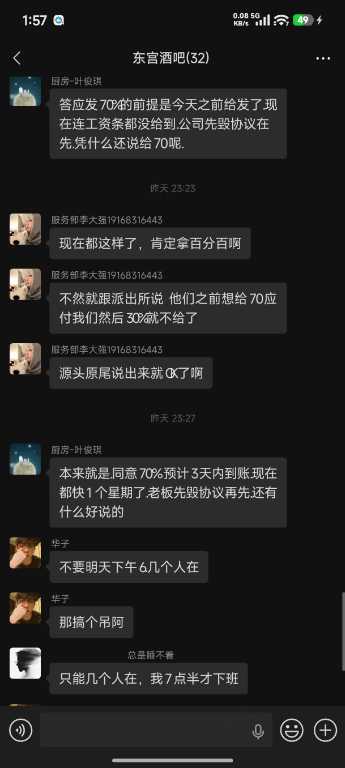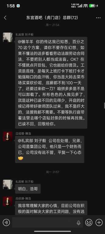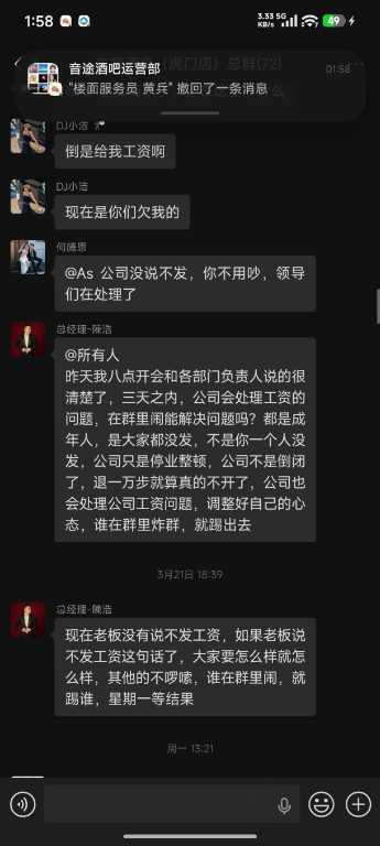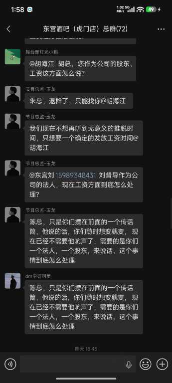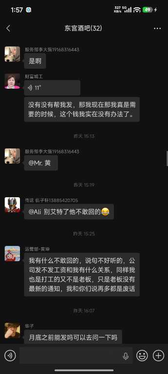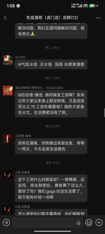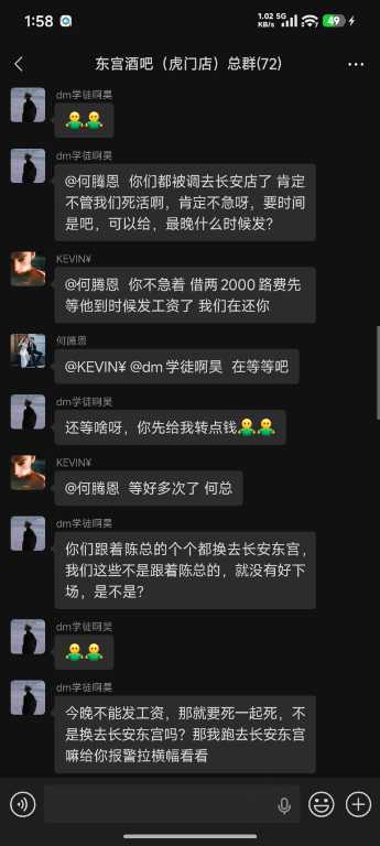 一月至三月的工资没发,上次说三天之内也没发,后面又说只发百分之70也没发一直拖着东宫酒吧老板朱斌一句话也不说,就拿总经理当传说筒,从管理到服务员安保和舞台部所有部门,总经理和其他管理的工资也没发朱斌这群也退了,人跑去深圳沙井东宫了,一直躲不处理