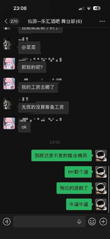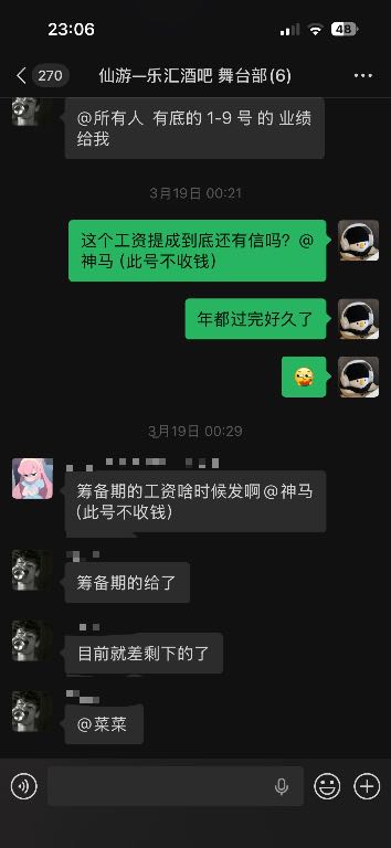 从2026年1月12日起 我们在福建莆田仙游县乐汇酒吧进入筹备 一开始说的各种保证说工资问题不用担心 结果呢我们尽心尽力帮忙招人招资源组 然后生意不行老板就开始降成本开始下人 虽然能理解 但是一直说工资会发会发 自2月10号起我们整个舞台就集体离职撤走了 年前到现在4月1日 说会给我们发工资 一拖再拖 到现在直接退群了 虽然没多少 但是足够恶心了 这位自称黄校长的 仙游做场的同行们自己注意