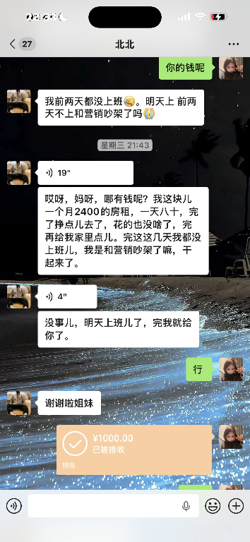 我是顾客之前点过他几次后面就找我借钱了人应该是东北的 借钱以后每天都说明天明天 这种找顾客借钱的还是避雷远离点吧如果有知道在哪个酒吧麻烦联系一下