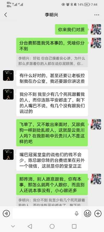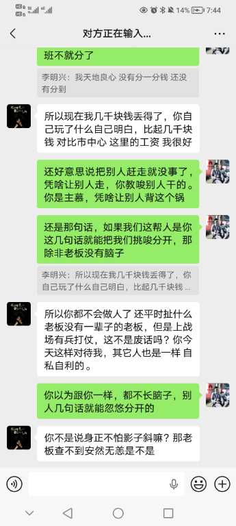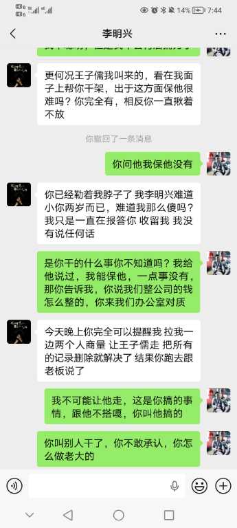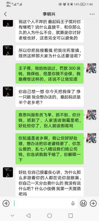 此人,名叫李明兴(主管),王子儒(服务员),叶星亮(服务员),由于一直以来没有碰到好场子,说到处碰壁,没有办法了,吃不上饭,在苏州拿不到工资,去山东没有生意,天天跟我发信息说很难,由于是老乡,我可怜他,把他收入麾下做了一名主管,其他的两个是服务员,2026年3月6号来我这里上班的,来的时候表演还不错,嘴巴也会说恭维话,来了一个月不到,李明兴叫我说联合飞单,我不搭理他,结果她叫上服务员王子儒跟他联合飞单,把散客现场点单的钱收了,然后悄悄点抖音套餐,298选的啤酒点抖音188元,100元的开台套搞成抖音50元,主管干告诉服务员说飞单了两个人五五分账,被股东发现了,被我查看聊天记录查到了,聊天记录还说不让我知道,不让叶星亮知道,说是叶星亮捣的鬼,结果呢查到了以后我让他呢处理,我给王子儒说,他不是主谋罚款300元,我来保他,主管保不了,因为这个事情很严重,而且是主谋,必须干掉,结果呢2个人怕被打,怕被送派出所就跑路了,说工资也不要了。起初劝他们回来聊聊,把事情谈开,该罚款罚款,正常走,不敢回来,到处给股东散播谣言说我吃发光物品回扣,吃服务员开台费,到处跟疯狗似的一通乱咬,温馨提示,各大夜场老板,领导注意避雷,小心,千万小心,以上信息我以人格,句句属实。现在还在到处爆黑我,说我飞单,吃回扣,实际店都不是我筹备的,我怎么吃果盘架回扣,一个二傻子,夜场害虫